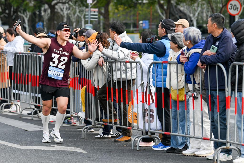2026年3月15日,上海,一名外国选手张开双手冲过终点。澎湃新闻记者 朱伟辉 图
