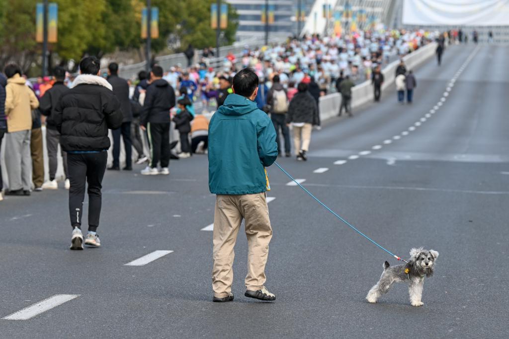 2026年3月15日,上海,一位观众牵着小狗前来观看比赛。澎湃新闻记者 朱伟辉 图