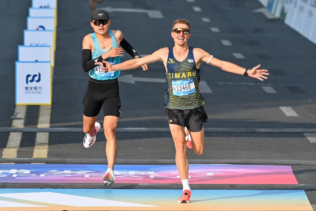 2026年3月15日,上海东方体育中心,来自肯尼亚的男选手所罗门·基尔瓦·叶戈率先冲过终点线,以1:00:57的成绩夺得冠军。澎湃新闻记者 朱伟辉 图